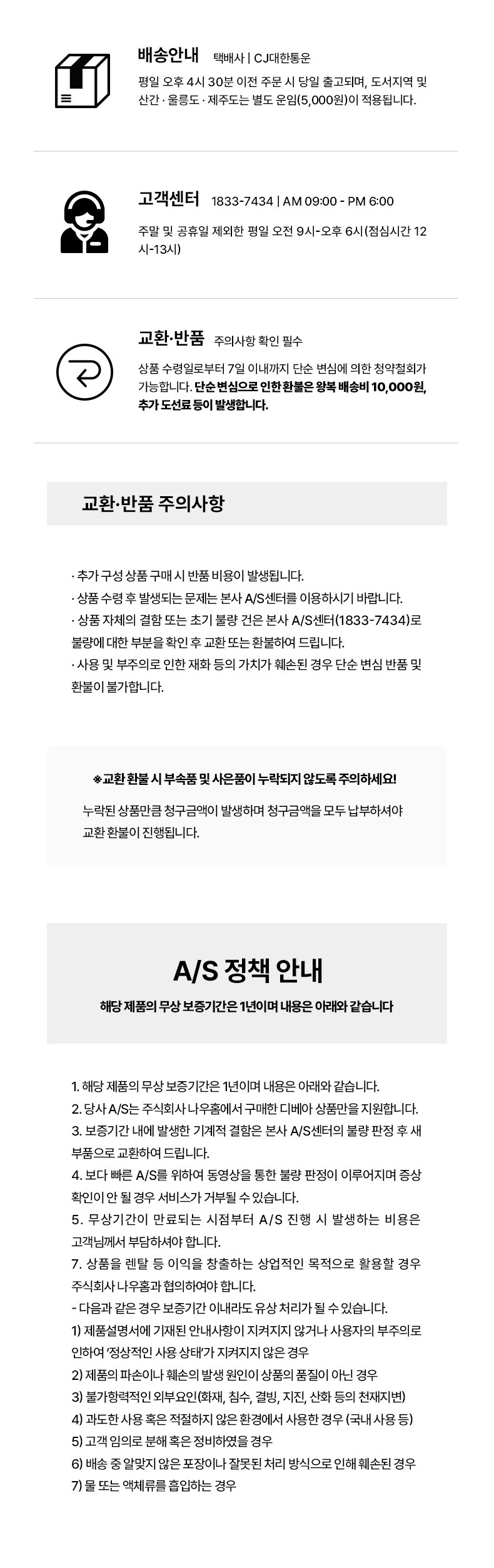 | 교환/반품 비용 | 1) [총 주문금액] - [반품 상품금액] = 19,800원 미만인 경우 반품비 5,000원 2) [총 주문금액] - [반품 상품금액] = 19,800원 이상인 경우 반품비 2,500원 |