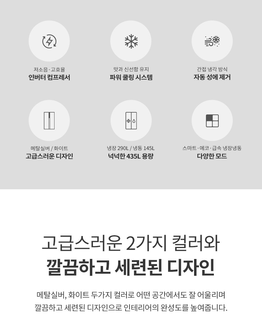 이 냉장고의 외관 디자인은 “한눈에 들어오는 레트로 감성”과 “양문형의 모던함”이 조화를 이룹니다.