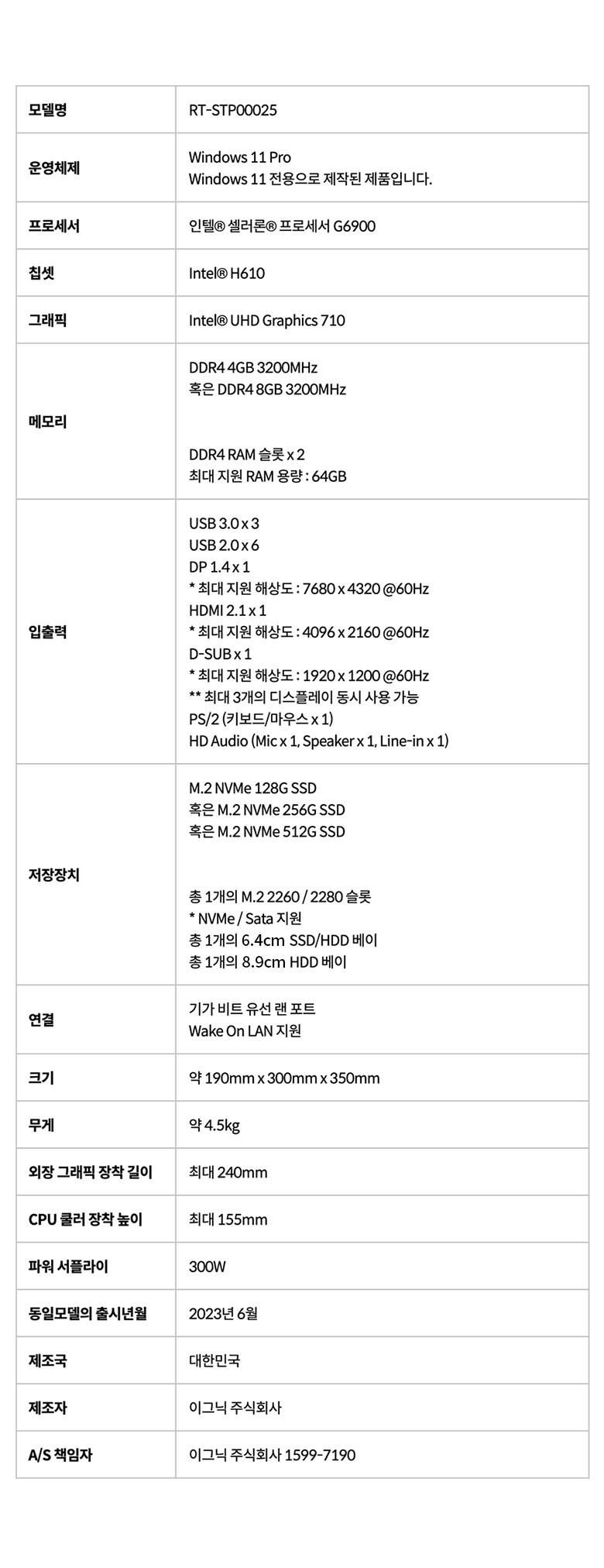 | A/S 책임자와 전화번호 | 상품페이지 참고 |